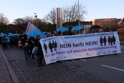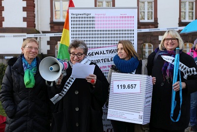 Am 8. März 2016 vor dem Justizministerium in Kiel: Die Vorstandsfrau des bff (Bundesverband Frauenberatungsstellen und Frauennotrufe), Ursula Schele sowie Angela Hartmann, Geschäftsführerin des LFSH (Landesverband Frauenberatung Schleswig-Holstein) übergeben Justizministerin Anke Spoorendonk die Resolution für ein modernes Sexualstrafrecht, die bis dahin knapp 120.000 Menschen unterschrieben haben.